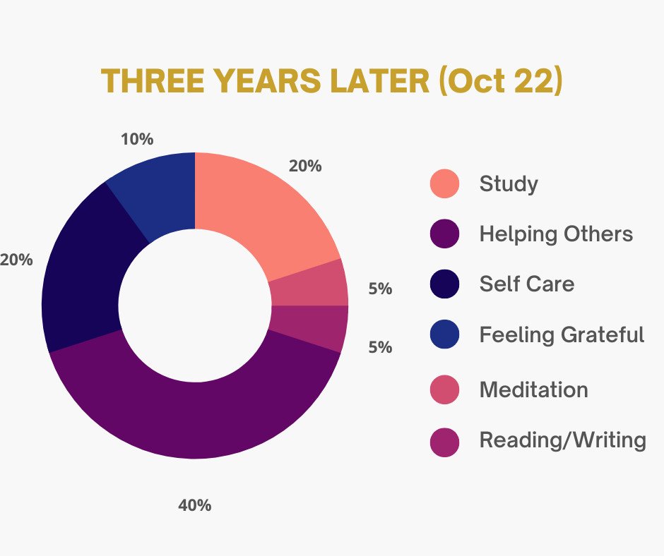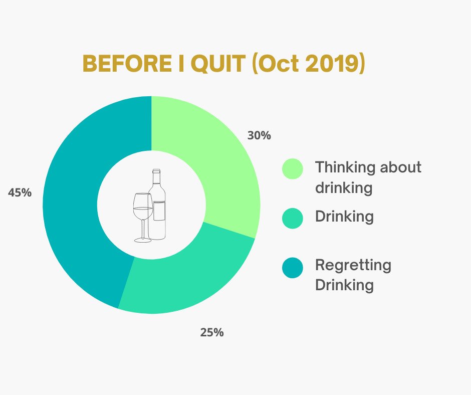 The graphs I’ve added to this post show how my drinking-related time & headspace over 3 years has evolved. It was a cool exercise to do. If I’d done up the charts in years 1 and 2 they would show huge segments of anxiety, workaholism, and beating myself up. The final chart for this year is where I am finally happy, for now.